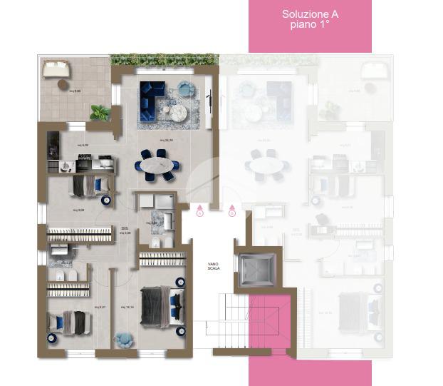 L'appartamento è composto da: ampio soggiorno,cucina, tre camere da letto,due bagni e un comodo terrazzo nella zona giorno.
