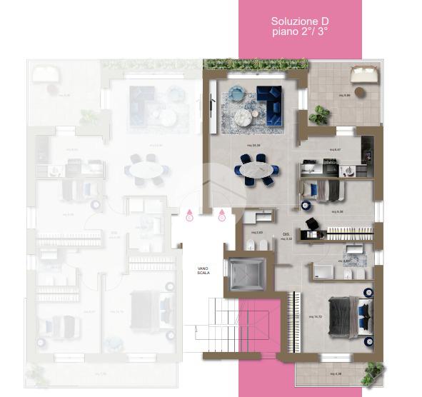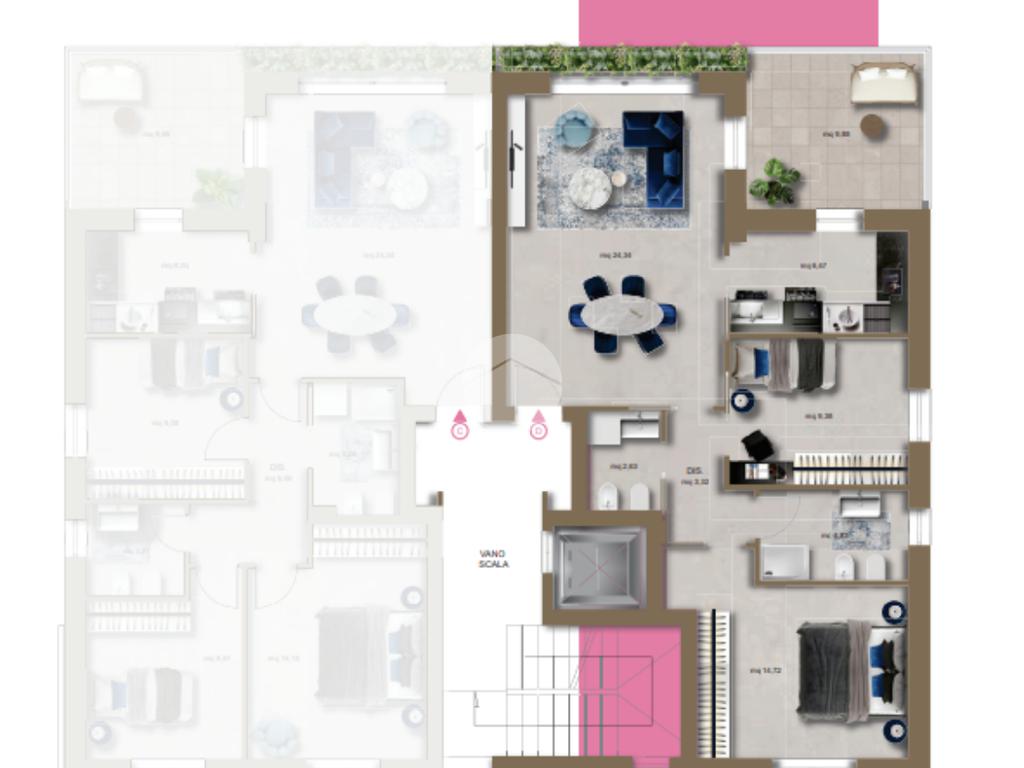 L'appartamento è composto da:soggiorno,cucina,camera matrimoniale,cameretta,due bagni e un comodo terrazzo nella zona giorno e un balcone riservato alla camera matrimoniale.
